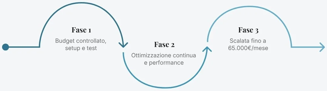 Il sistema non è stato costruito tutto in una volta. La logica di crescita è stata deliberatamente progressiva e basata sui dati: iniziare con budget controllati, ottimizzare continuamente le performance, poi scalare gli investimenti solo quando le metriche confermavano la solidità del sistema.
